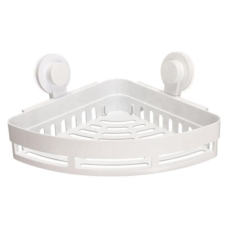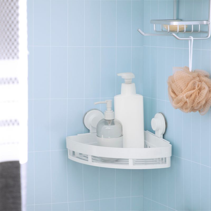 Organizador esquinero para baño con succión de plástico ABS y PP. Su diseño drena el agua manteniendo todo limpio y seco. Los soportes se instalan fácilmente en todo tipo de superficies lisas. Su diseño compacto y resistente permite almacenar productos de uso diario de forma segura, sin necesidad de perforar muros. Ideal para mantener tus espacios ordenados y aprovechar mejor cada superficie (Incluye instrucciones de instalación)