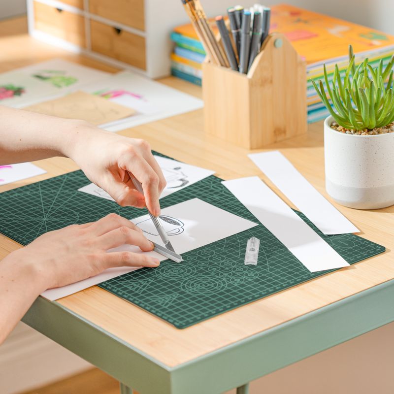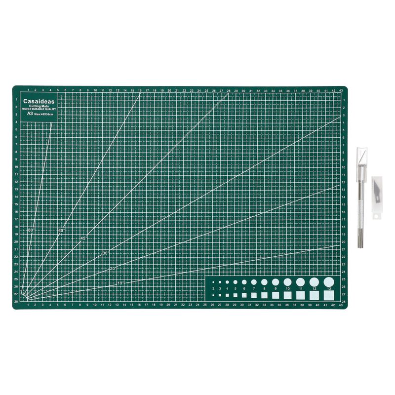 Plantilla de PVC, incluye cortador y hojas de repuesto. La plantilla de corte se utiliza para trabajar con corta cartones, cuchillos o bisturís. Permite proteger otras superficies como tableros de mesa, vidrios o cualquier lugar sobre el que se trabaje. La plantilla viene con un dibujo cuadriculado en pulgadas. Además cuenta con líneas para realizar cortes en 45 y 60 grados.