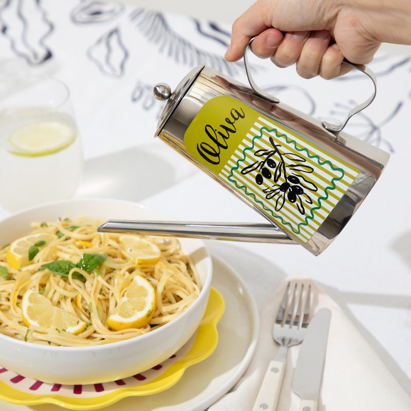 • ComedorAperitivos y EspecialidadesPizzaAceitero con Mango Metalico y con Diseño 400 ml