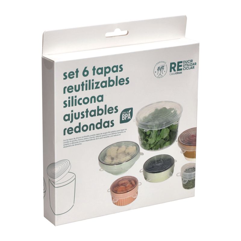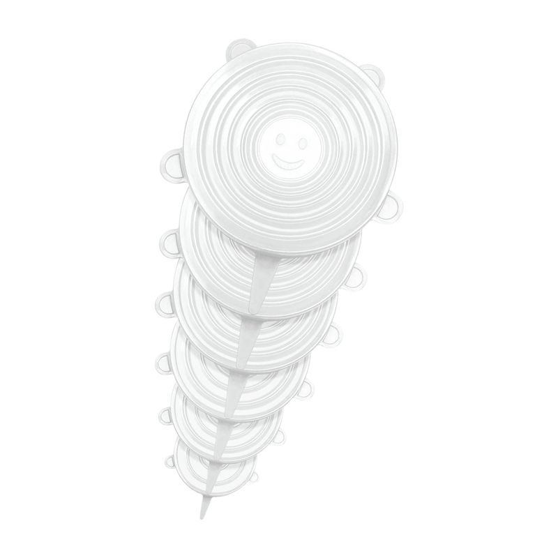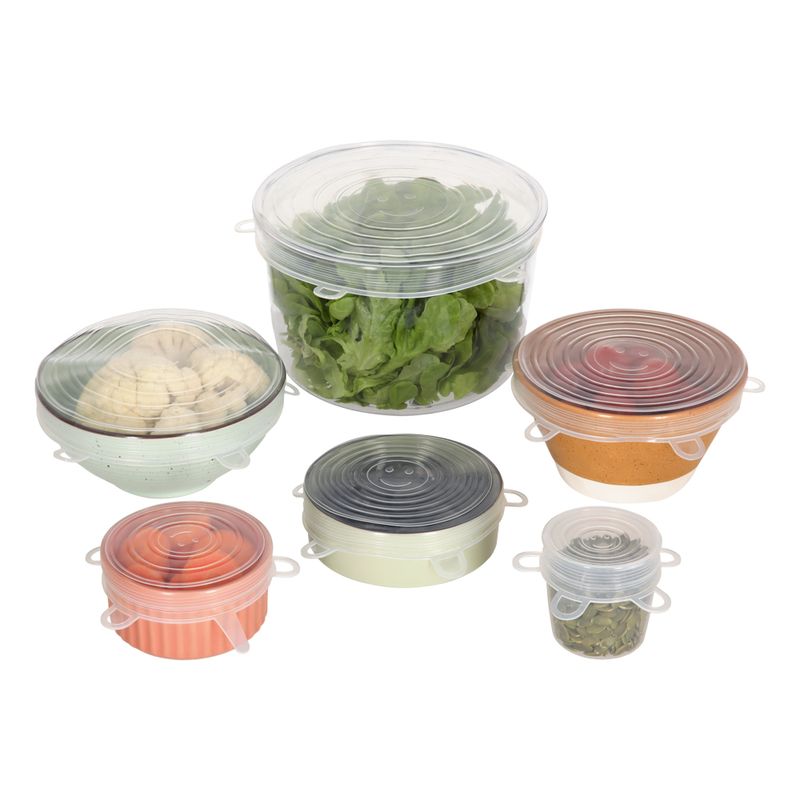 Set 6 tapas reutilizables-ajustables de silicona. Cuenta con 6 medidas distintas.