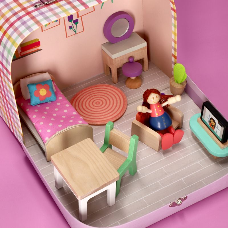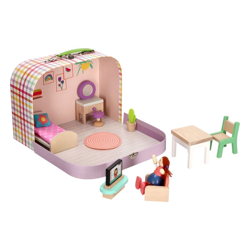 Niños y bebéJugueteríaMuñecas, casas y accesoriosMaleta con Mobiliario de Madera Dormitorio Castilá