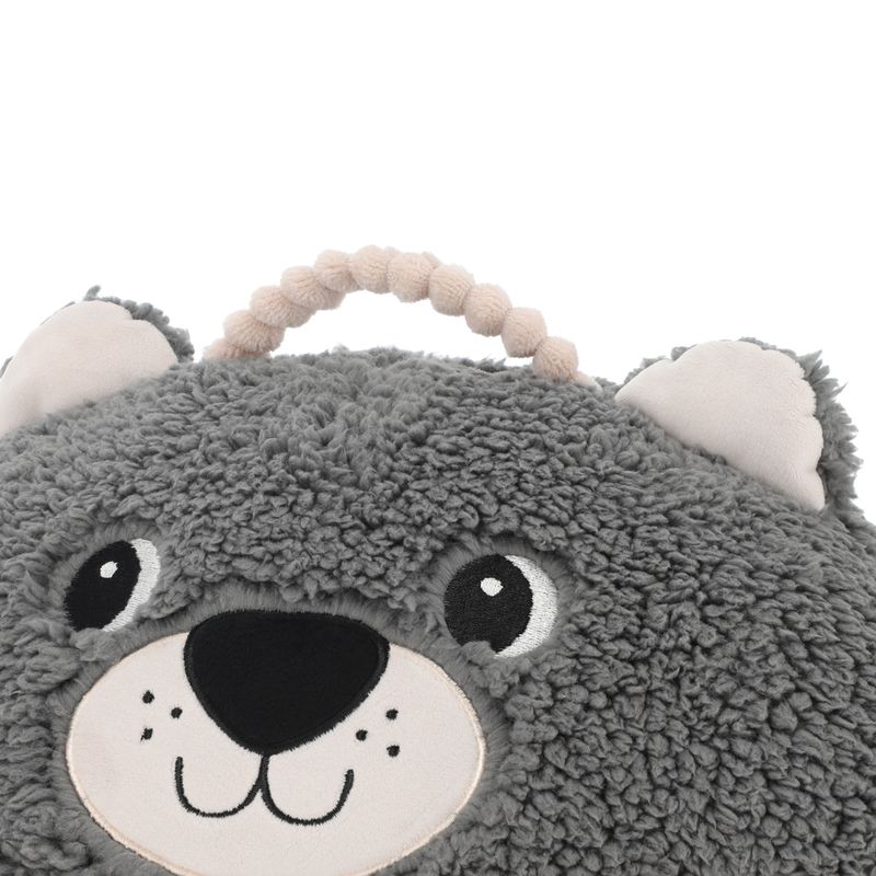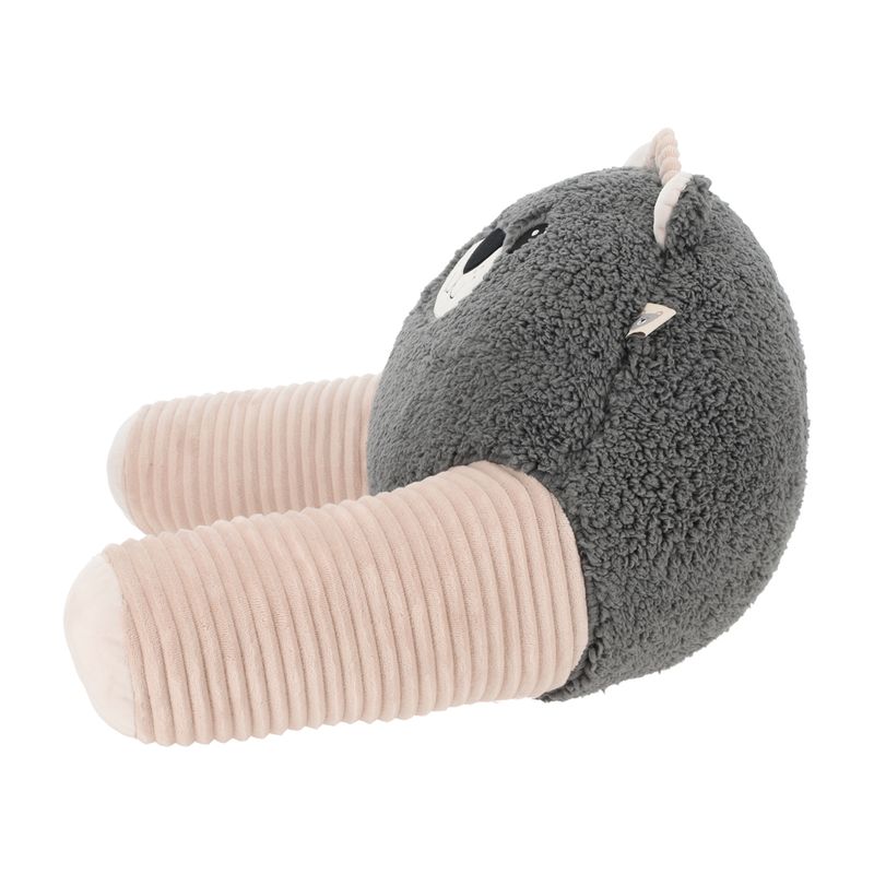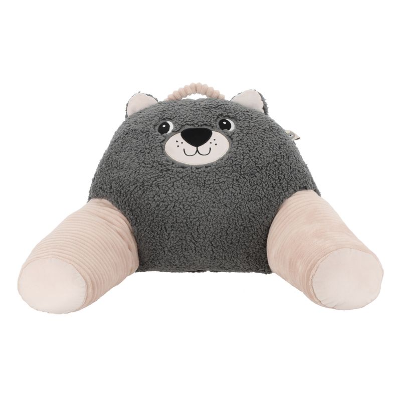 Cojín con respaldo y forma de animalito con cubierta y relleno de poliéster. Este producto es acogedor y suave, ideal para sentarse sobre la cama o sillón.
